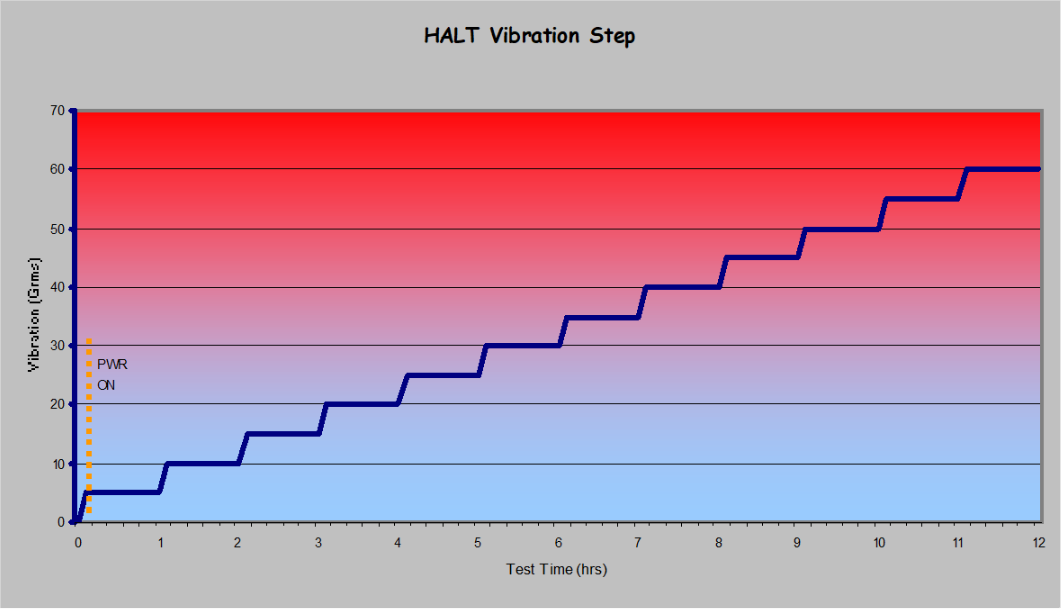 振动以5gRMS/hr的速度递增,直到达到振动台输出的最大能力。对于 Qualmark T4.0试验箱,我们使用的值是75gRMS。应使用加速度计来确定传递到UUT上的振动量级。通常,特别是当UUT是较大系统的一部分时,只有少量振动台振动会传递到测试对象。
